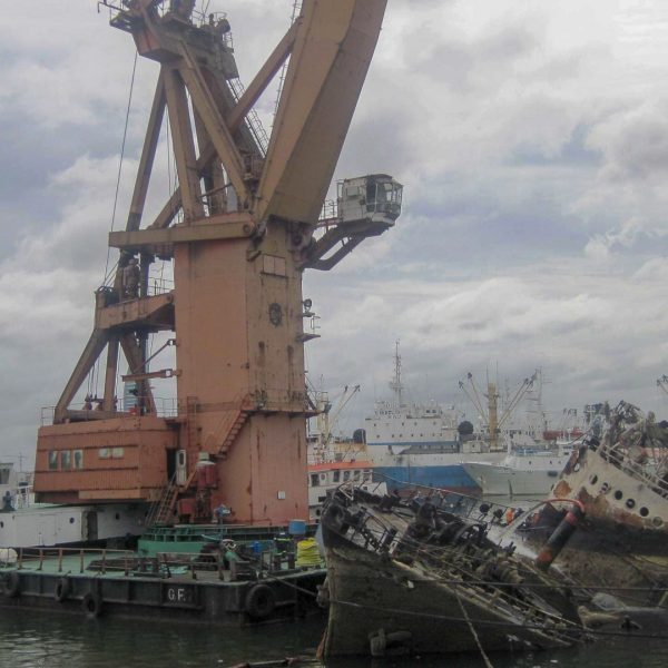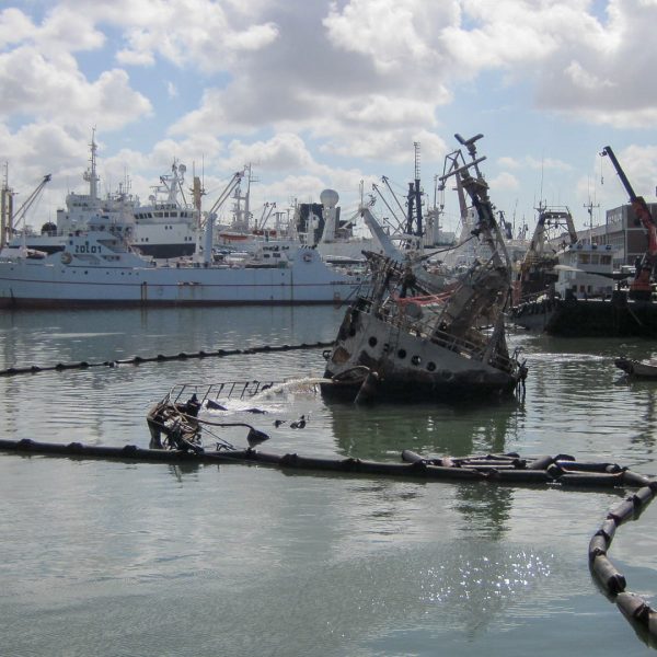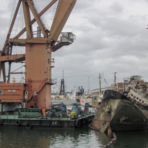 Siniestrado y hundido luego de incendio total; recupero de compartimientos y reflotamiento mediante achique y medio de izado externo, realizado en Muelle 9/10 del Puerto de Montevideo.