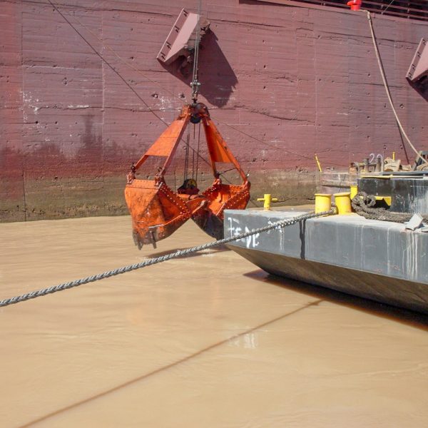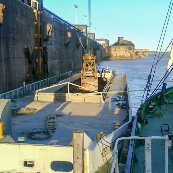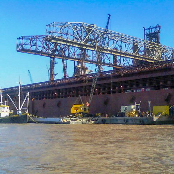 Dragado mecánico mediante pontón grúa, balde almeja y chata tipo “gánguil” a fin de extraer 21,750 m3 de barros sedimentados en el frente del Muelle Productos Generales, Villa Constitución, Santa Fe.