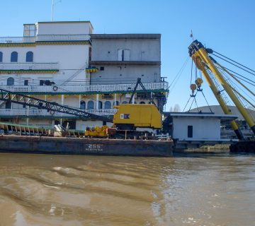 Montaje de estructuras, galerías y pescantes de carga en la reconstrucción del muelle con Pontón POSEIDÓN y Grúa AMERICAN de 140 tons con 60mts de pluma.